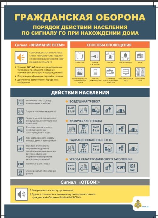 Гражданская оборона — это система мероприятий по подготовке к защите и по защите населения, материальных и культурных ценностей на территории Российской Федерации от опасностей, возникающих при военных конфликтах или вследствие этих конфликтов, а также при чрезвычайных ситуациях природного и техногенного характера.