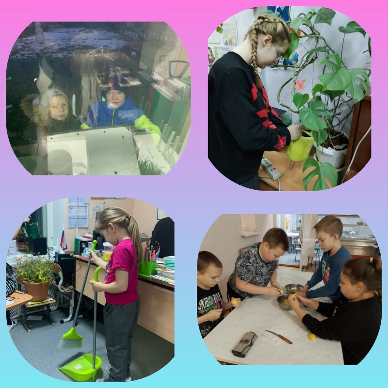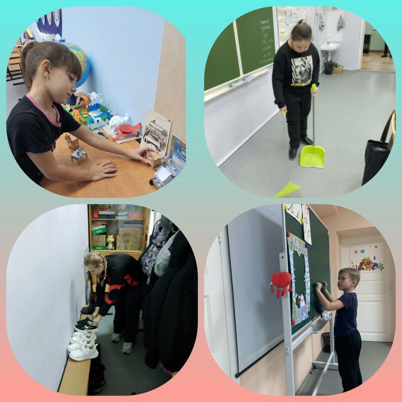Устроили генеральную уборку: протёрли подоконники и парты, навели порядок на столах и в раздевалке, подмели полы