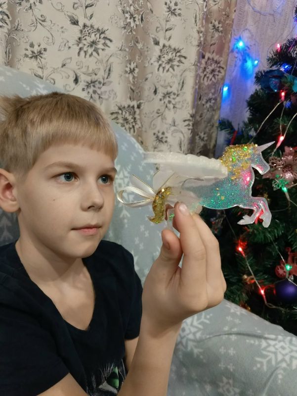 А вечерами я увлекаюсь эпоксидной смолой. Это волшебный материал! Вот такая сияющая лошадка у меня получилась! »